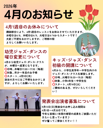 4月から幼児ジャズ・ダンス・クラスが、木曜日へ変更になります。